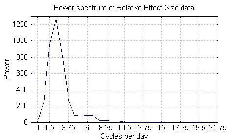 We can analyze the sequence of effect sizes as a function of local sidereal time in the same way. The data plotted in Spottiswoode's Figure 3 was digitized manually at the same resolution as Walker's EGG plots, and the left side of Figure 2 displays the result. The accompanying spectrogram shows only one significant periodicity at 2.25 cycles/day which corresponds to a cycle length of 10.67 hr. If the effect size data does contain a periodicity near 3.75 cycles/day, it is swamped by the much stronger 2.25 cycles/day. Given the different periodicities in the two data sets, we cannot yet say that EGG behaviour and ESP performance may be influenced by a common source.