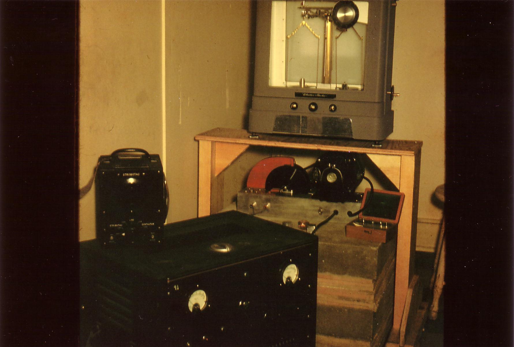 After viewing the left photo, John recalled that the scales at the top were set to record any changes in gravity if a flying saucer flew near. The smaller item at the left is a General Radio tachometer, probably model 'Strobotac 631-Bl'. The lens for the strobe light is just out of sight on the right side of the box. Its only purpose would be to measure the speed of a rotating device. Below the scale and mounted on an inertial platform is such a rotating device, belt-driven by a fractional horsepower GE motor. It probably was the target for the tachometer. For stability, the platform rested on bedrock below ground level. The apparatus mounted on it somehow measured changes in seismic activity. Even with the closer view in the right photo it is not obvious how this was achieved. Also sitting on the platform is a box containing what appear to be scale weights. The tachometer is resting on a custom-made device (with two panel meters), perhaps a single-frequency LF receiver (500 kcs). If so, its purpose would be to monitor the international emergency LF frequency. There were other receivers set on HF frequencies. |