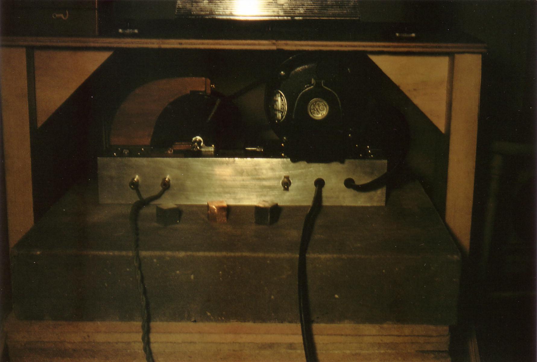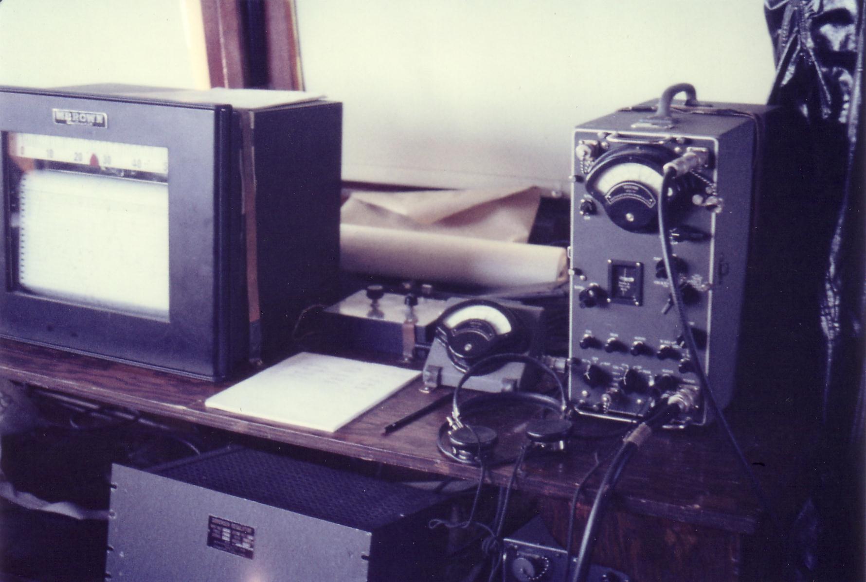 The following photos taken by Wilbert Smith show several pieces of equipment that he may have used in the attempt to detect the passage of alien aircraft nearby. The photos were made available by James Smith in 2006. The equipment in the photos was identified by John Wilson, a technician at the Radio Physics Laboratory (RPL) at Shirley's Bay when the saucer detection station was established. John recalls that "as a technician at RPL I shared a field hut down near the brick Department of Transport building. Wilbert Smith had been permitted to use the same hut for his flying saucer searches. I was the one who visited the site almost daily and volunteered to check his equipment, i.e., retune any drifting receivers and make sure the Esterline Angus pen recorders had paper in them and were well inked up - that sort of thing. It was common knowledge at the time that Wilbert wanted to measure anything that changed if the area was visited by his IFO friends. I don't remember any of us who completely discounted his quest, mostly 'a wait and see' attitude. The parameters most likely considered for examination were: LF, HF and VHF signals or noise changes, atomic radiation, seismic activity, magnetic disturbances, gravity changes, and temperature. As I recall, there was nothing special in there, a collection of equipment not needed elsewhere. I do recall a geiger counter and one receiver tuned to the 500 kcs emergency frequency".