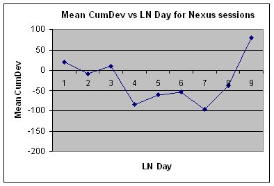 The sum of the session CumDevs on LN days 1, 2, 3, 8, and 9 is 21.712 (df= 90,000), while the sum for LN days 4, 5, 6, and 7 is -1386.31 (df= 54000). The former deviation from chance is not statistically significant, but the latter indicates a highly significant overall reduction in EGG variance with p= 1.04 x 10-5. This statistical test is post hoc and needs to be confirmed with new data. Nevertheless, it supports the observation from each of two separate meditation series that the meditation effect might be expected primarily during LN days 4, 5, 6, and 7, and gives us some confidence that the 9-day cycle is not due to chance.