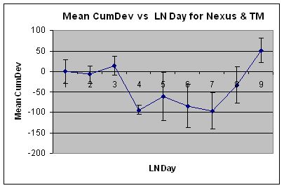 Figure 9. Mean CumDev for Nexus and TM meditations as a function of LN day. |