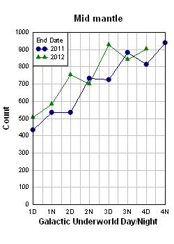 Figure 4 shows the total earthquake counts at different depths for the first four Days and Nights of the cycle. As predicted, there is something different going on for both end dates at the lower mantle next to the core than at higher depths. For the 2011 end date, almost all of the lower mantle Night counts are higher than the Day counts, while the converse is true for the 2012 end date. The phase shift in the counts of the lower mantle over Days is obviously a result of the 420-day difference in the end dates. Possible traces of the oscillating patterns are visible in the mid-mantle and the crust.