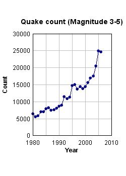 Figures 1, 2, and 3 present an overview of earthquake activity from 1980 to 2006. Figure 1 shows the counts for large quakes between magnitudes 5 and 10. On average, the frequency of large quakes has remained relatively constant over the years. Note, however, that the highest frequency occurred in 2005. Figure 2 shows the counts for magnitudes between 3 and 5. Here, there is a quadratic, almost 5-fold increase between 1980 and the present. It is possible that this is due to a continuous improvement in the sensitivity of the network of seismometers over the years so that weaker tremors were more likely to be detected from one year to the next. Otherwise, something is causing the actual frequency of smaller earthquakes to increase over time.