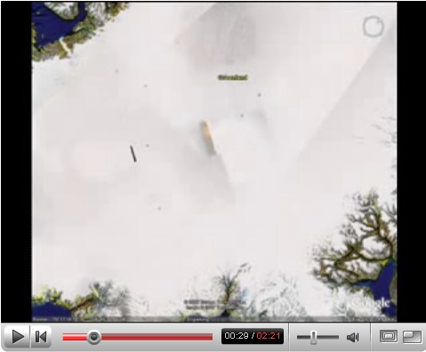 A related unexplained observation involves a YouTube video posted in September, 2007, containing Google Earth images of the Greenland object. Unfortunately, the video is no longer available online. In the following GE frame extracted from the video we can see six black dots near the oblong object. These are seen more clearly in the accompanying enhanced version of the frame. The dots are almost as big as the oblong object's width, so we can estimate their diameters to be at least 2-3 km. These dots were no longer in the online GE image after the beginning of December, 2007. Assuming that the dots were not fraudulantly added to the image shown in the video, the GE image must have been updated sometime before December. The updated image still shows the oblong object, suggesting that it is a real object on the ground. If it were a random image processing artifact, it should have disappeared after the update.