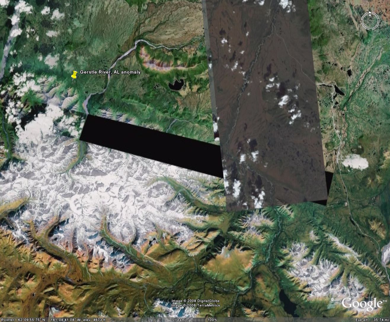 The following presents the images and a discussion of the relevant features. Notice that the Gerstle River anomaly has already been overlaid with an image strip that does not contain the anomaly. This indicates that, if the anomaly were actually an object on the ground, it is no longer there. The black object in Greenland is accompanied by another large, colorful, equally mysterious object which is ignored in this discussion.
