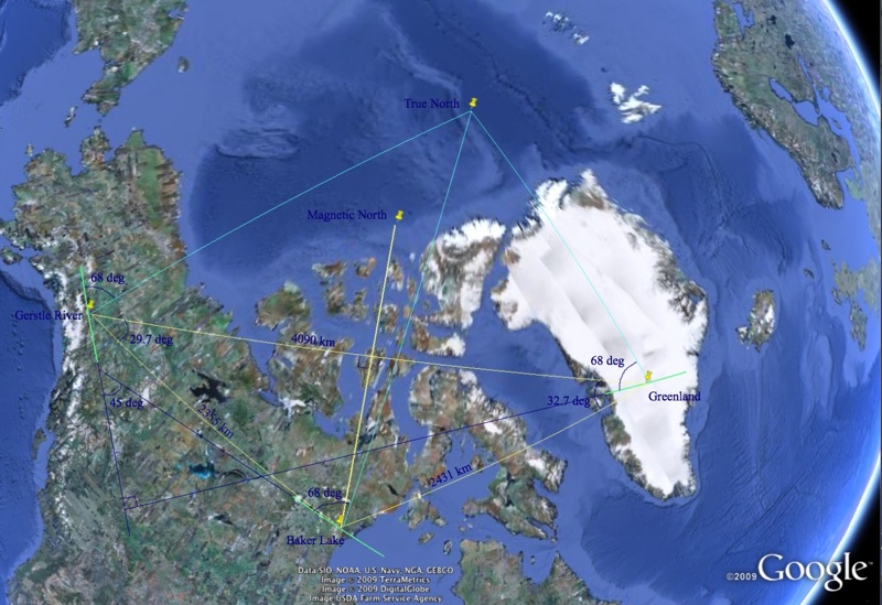 The green line segments at the vertices of the yellow triangle show the orientations of the objects, which are too small to be seen at this magnification. Notice that the line extending the Greenland object is exactly perpendicular to the line extending the Gerstle River object, and that the angle between the extended Baker Lake object and the other two is 45 degrees.
