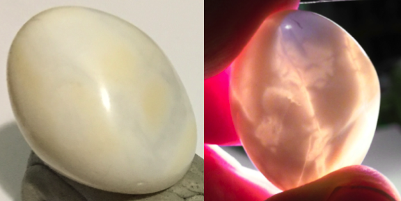 Before the anticipated apport was produced, the medium’s voice advised that it would have internal structures made of ectoplasm. The crystal was subsequently examined by backlighting it in a dark room, and this procedure revealed remarkable details in its interior. Representations of a male and female head were visible inside the crystal when it was viewed at a particular orientation. The right panel of Figure 1 shows the image of the male in the upper half of the backlit crystal, and the image of the female in the lower half.