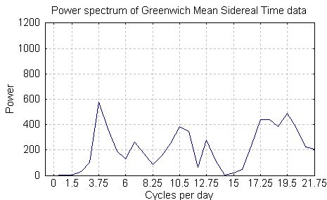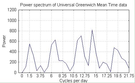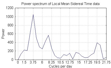 It is clear from the spectrograms that the strongest cyclic behaviour occurred in the mean EGG data plotted against Local Mean Sidereal Time (LMST) in the last graph of Figure 1. Here the power is greatest at a periodicity of 3.75 cycles/day. This translates to a cycle length of 6.4 hr. It is interesting that Spottiswoode (1997) found LMST to be related to human ESP performance across a large number of experiments. Spottiswoode showed that the mean effect size in these experiments increased by about 350-450 percent in the hour spanning 13.5 hr local sidereal time. He concluded that "this is evidence of a causal connection between performance and the orientation of the receiver (i.e., a term for subject or participant), the earth and the fixed stars". Since both EGG behaviour and ESP performance appear to be subject to changes in human consciousness, it should not be too surprising if they share a correlation with another variable.