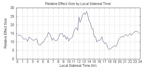 It is worth noting that the peak effect size at 13.5 hr corresponds to a minimum in the mean EGG values. Since the lower EGG values were not a specific target in a psychokinesis experiment, this deviation from chance cannot be construed as an effect size. If the periodicities were similar, we could say only that the lower mean EGG values result from an influence that also facilitates a large effect size in ESP experiments, and that this influence varies with local sidereal time.