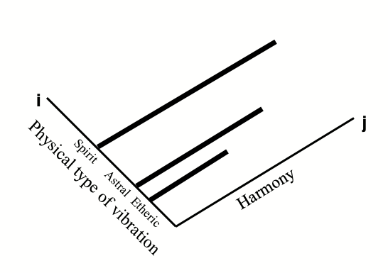 Figure 1 shows a drawing of the model limited to two dimensions. One axis is labelled “Physical type of vibration” which identifies the vibrations of planetary realms beyond the reach of the human race. A bar extending from this axis as a base shows that the being has evolved to a certain level on the “Harmony” dimension. High vibrations on this dimension are correlated with unconditional love, harmony, forgiveness, and other positive states that all entities hope to achieve eventually.
