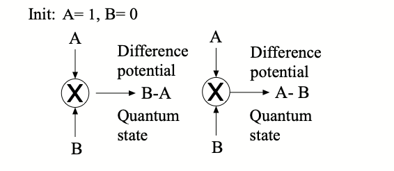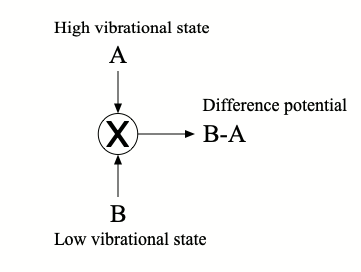 An analogous process occurs in the vibrations of consciousness. Two beings existing at widely different states of consciousness or vibration may interact to create a potential at the difference between them (Treurniet and Hamden, 2022a, Chapter 15). In Figure 2, A and B represent the respective high and low vibrations on a particular dimension. Intention, signified by X, is analogous to the non-linearity of the physical transistor. The difference potential, (A-B), is a potential at the difference between the input vibrations. It is created with the intention of the participants and enables them to resonate at that shared potential.